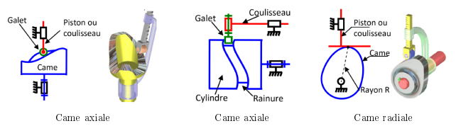 On appelle «came» une roue qui a la forme d’un œuf. La came peut aussi être un disque de forme irrégulière ou un disque dont le pivot est décentré. Dans ce cas, on parle d’«excentrique». On appelle «tige-poussoir» ou «tige guidée» la tige qui est appuyée sur la came. Lorsque la came tourne, la tige-poussoir effectue un mouvement de translation alternatif (mouvement de va-et-vient rectiligne).