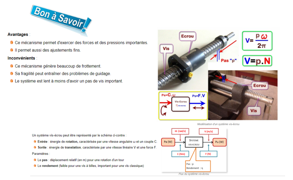 Le système à vis et écrou permet de transformer un mouvement de rotation en un mouvement de translation en combinant les mouvements d’une vis et d’un écrou.