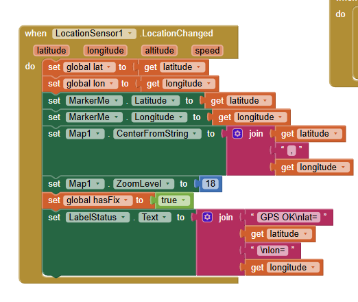 set Map1.ZoomLevel to 18 set global hasFix to true set LabelStatus.Text to join